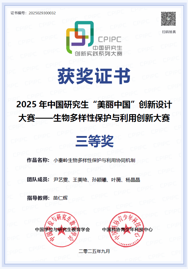 在2025年中国研究生“美丽中国”创新设计大赛——生物多样性保护与利用创新大赛全国总决赛中,学院教师苗任辉指导的“小秦岭生物多样性保护与利用协同机制”项目亦脱颖而出,荣获全国总决赛三等奖。值得注意的是,这是我们研究生首度参加此项赛事。中国研究生“美丽中国”创新设计大赛是由教育部学位与研究生教育司指导,中国学位与研究生教育学会、中国科协青少年科技中心主办的“中国研究生创新实践系列大赛”主题赛事之一。中国研究生“美丽中国”创新设计大赛——生物多样性保护与利用创新大赛,是中国研究生创新实践系列大赛主题赛事之一——中国研究生“美丽中国”创新设计大赛的专项赛事。