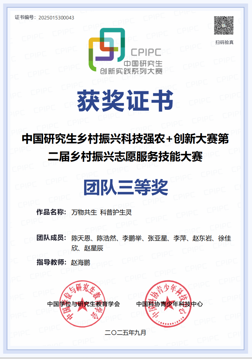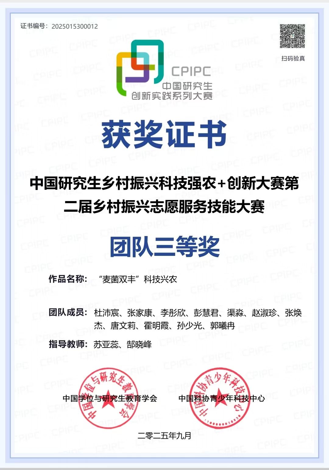 9月19日至22日,由中国学位与研究生教育学会、中国科协青少年科技中心主办的第二届乡村振兴志愿服务技能大赛在山东烟台举行,本届大赛共吸引了全国187所研究生培养单位的1894个团队报名参赛,经专家评审,最终109所研究生培养单位329支团队进入决赛。最终,副院长赵海鹏指导的“万物共生,科普护生灵”项目荣获教育类志愿服务全国三等奖;学院教师苏亚蕊、郜晓峰指导的“‘麦菌双丰’科技兴农”服务团队荣获科技类志愿服务全国三等奖。