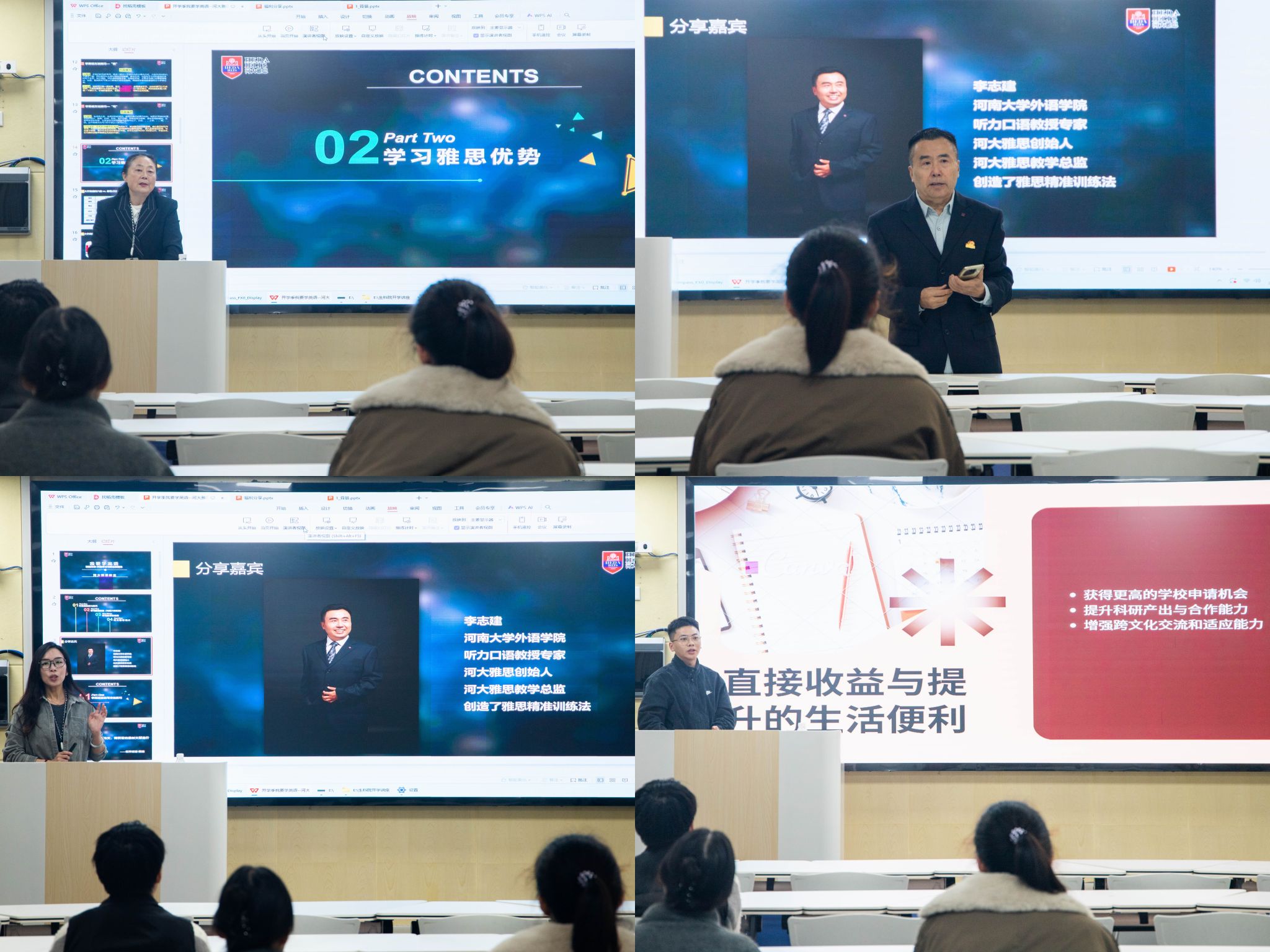 主讲老师围绕大学英语四级、六级、考研英语以及雅思考试的学习方法、备考技巧进行深入解析,从考试定位、题型设置及能力要求等多个维度,深入剖析不同考试的特色与差异。针对四、六级考试,老师着重提醒真题循环训练的关键作用,指导同学们从真题练习中总结高频考点与答题规律;面对考研英语,老师深入剖析其中常见的逻辑陷阱,帮助同学们准确识别干扰选项,进一步提升解题准确率;在雅思考试分享环节,老师聚焦“语言应用能力导向”的核心特点,从听、说、读、写四个模块的题型逻辑与评分标准入手,提供针对性的备考策略与实战技巧。