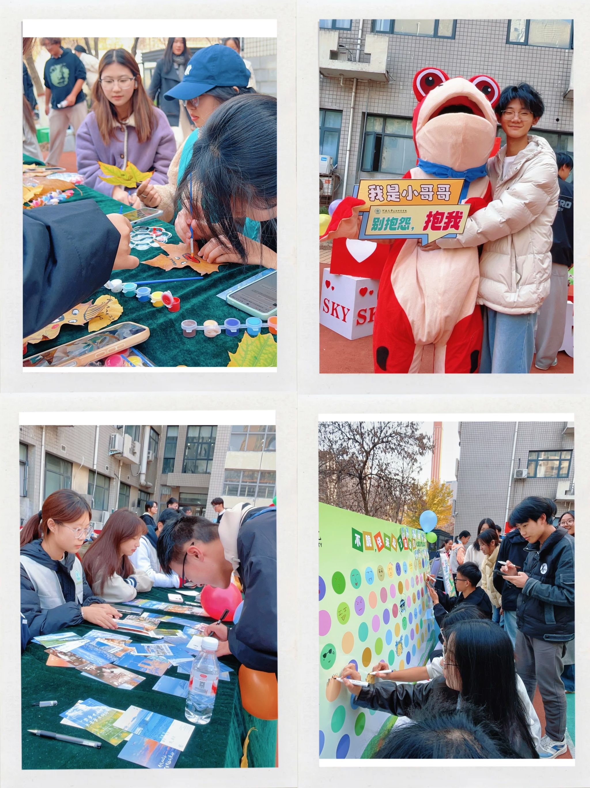以美育心,趣享治愈。11月13日,学院举行“不脆,快来赴了这场约”心理集市嘉年华,以多元美育体验为同学们缓解压力。集市包括“5摊1墙1抱抱”治愈快闪摊位,通过颜色和表情组合的“心情调色盘”,进行一秒自画像;“感恩留言墙”主题展板,让同学们留下给予自我帮助的一个人、回赠一句话,收获双倍温暖;“叶影绘心”摊位,借助光影将落叶轮廓拓印纸上,创作出专属作品;“片语浮光”让每一段温暖寄语都伴着自然意趣,在树叶上写下自己的座右铭,随机抽取现场互换;“套趣盆栽”快乐无限集结营里,同学们放肆欢笑,绿植、文创、糖果无限续,套中就有的快乐让大家流连忘返;“别抱怨·抱我”抱走烦恼抱抱团青蛙人偶互动将氛围推向高潮。活动让学生创作与互动中释放情绪、感知温暖,实现以美育人、以美化心的目标。