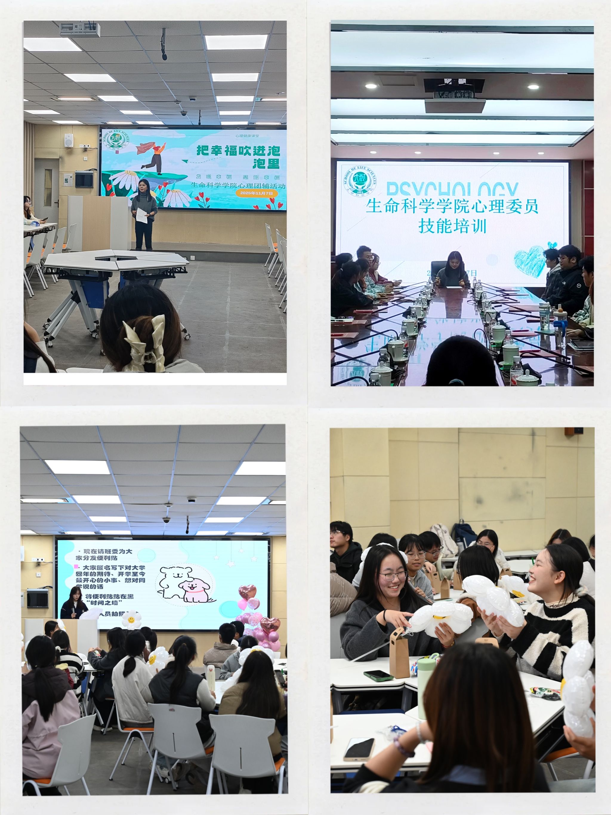 以智育心,解码情绪。聚焦情绪管理与认知能力提升,学院通过“情绪背后的心理需求”专题分享会、线上“情绪日记”,引导学生自我释压、自我疏导、积极向上。11月7日,学院组织本硕心理委员开展专题技能培训,内容涵盖朋辈沟通、心理危机识别、团体实践辅导等方面,持续加强心理健康教育队伍的能力建设。在“把幸福吹进泡泡里”互动课程中,同学们进行了情绪表达与相互鼓励,以大胆说出来、勇敢做出来的方式压力释放。同时,2025级新生各班围绕情绪管理、人际交往、环境适应、班级凝聚等主题开展特色班会,为新生应对心理困惑提供支撑。